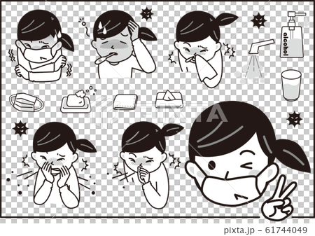 インフルエンザセット 子供 モノクロイラストのイラスト素材